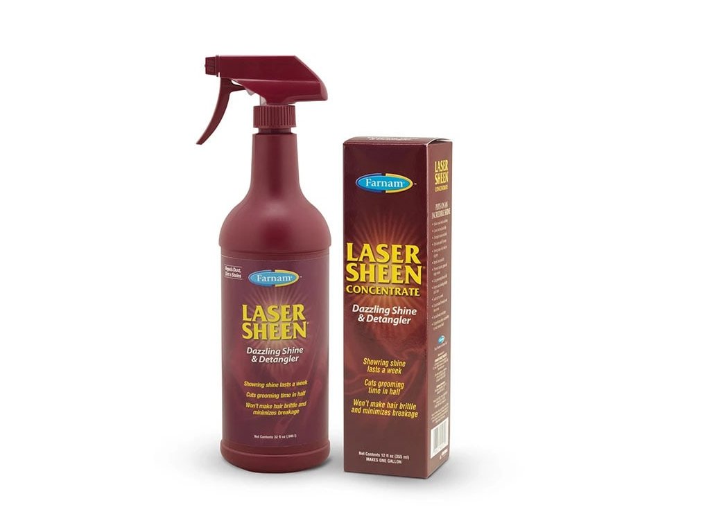 Poté přelijte do nádoby s rozprašovačem. Před každým použitím dobře protřepejte. Laser Sheen® aplikujte na srst, hřívu a ocas. Dostatečně rozprašte po celém koni dokud nejsou srst, hříva a ocas vlhký. Potom přejeďte rukou ve směru srsti. Nechte uschnout před případným kartáčováním, leštěním a přetírání rukou.