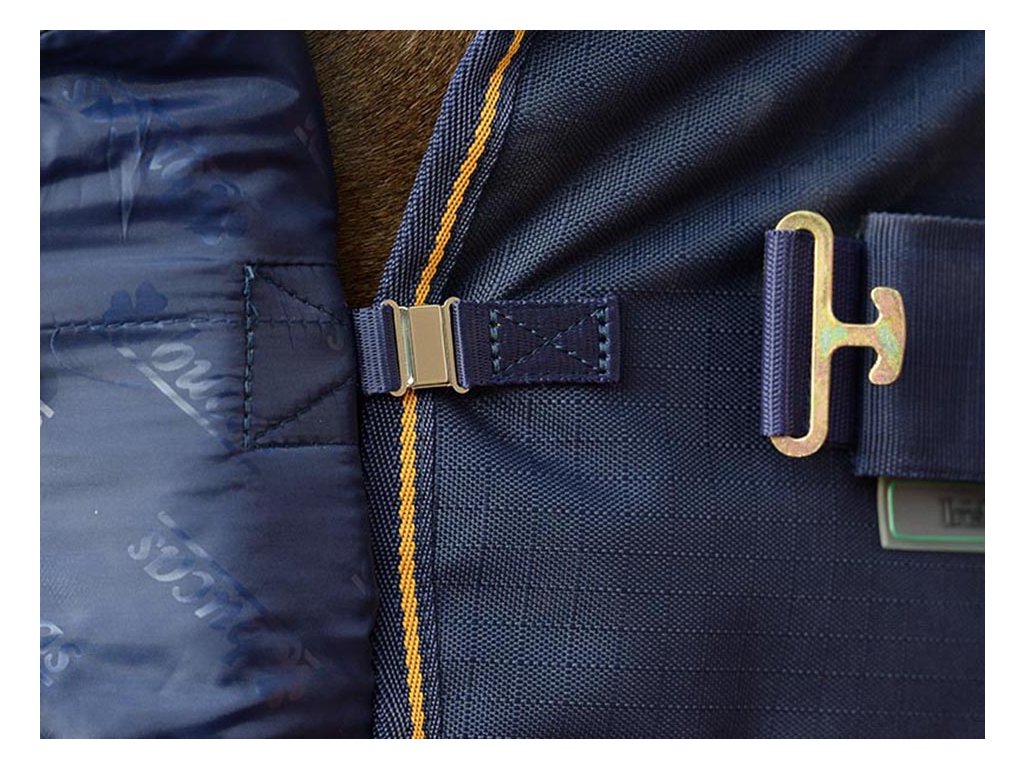 Deka je vybavena jednoduchým předním zapínáním na T přezku spolu s magnetickým zámkem Snap-lock, které je celé doplněné ochranným suchým zipem. Dalšími prvky jsou křížové zapínání pod břichem, popruh pod ocasem, ochrana ocasu a očka pro připevnění popruhů mezi nohy.