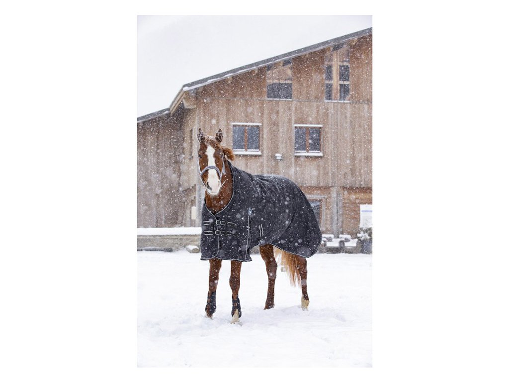 Nepromokavá deka vyrobená z polyesteru 300D s podšívkou z fleece. Deka má vsazené komfortní klíny pro volnost v pohybu ,vypodložený kohoutek umělým beránkem. Zapínání na plecích na dvě nastavitelné přezky. Deka má křížové zapínání pod břicho, popruhy mezi zadní nohy a kryt ocasu.